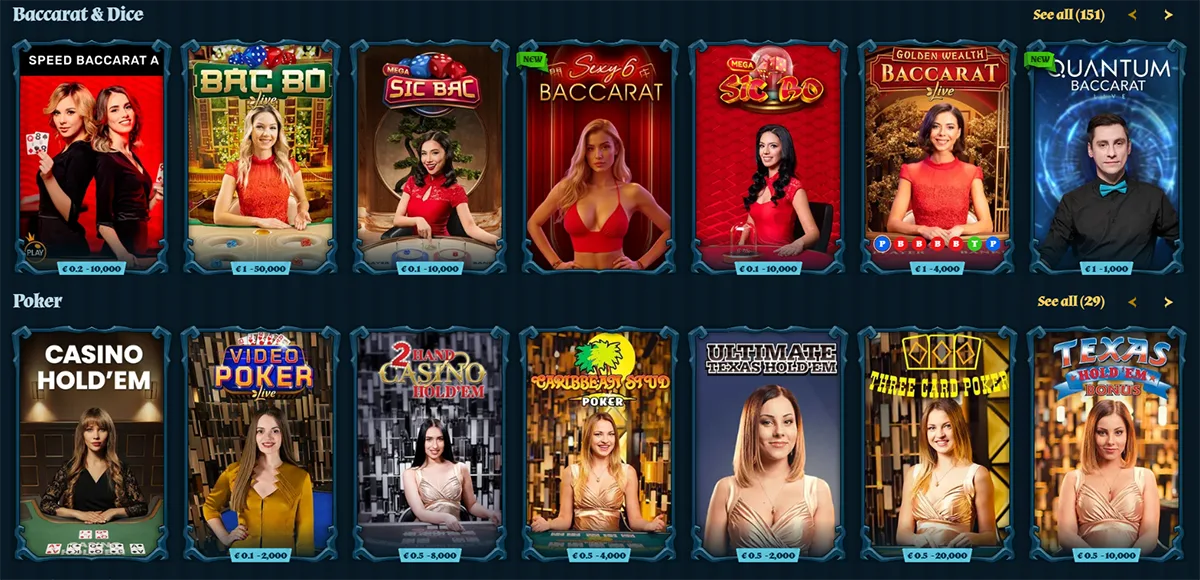 - Live poker games including Caribbean Stud and Three Card Poker
