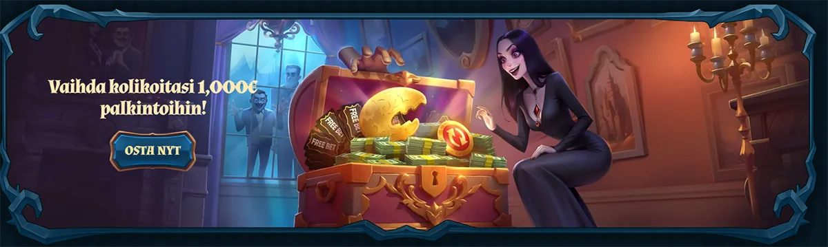 Ensimmäinen talletus aktivoi 100% talletusbonuksen jopa 500 € asti. Samalla saat 50 ilmaiskierrosta valituissa kolikkopeleissä. Minimitalletus bonuksen aktivoimiseksi on 20 €.