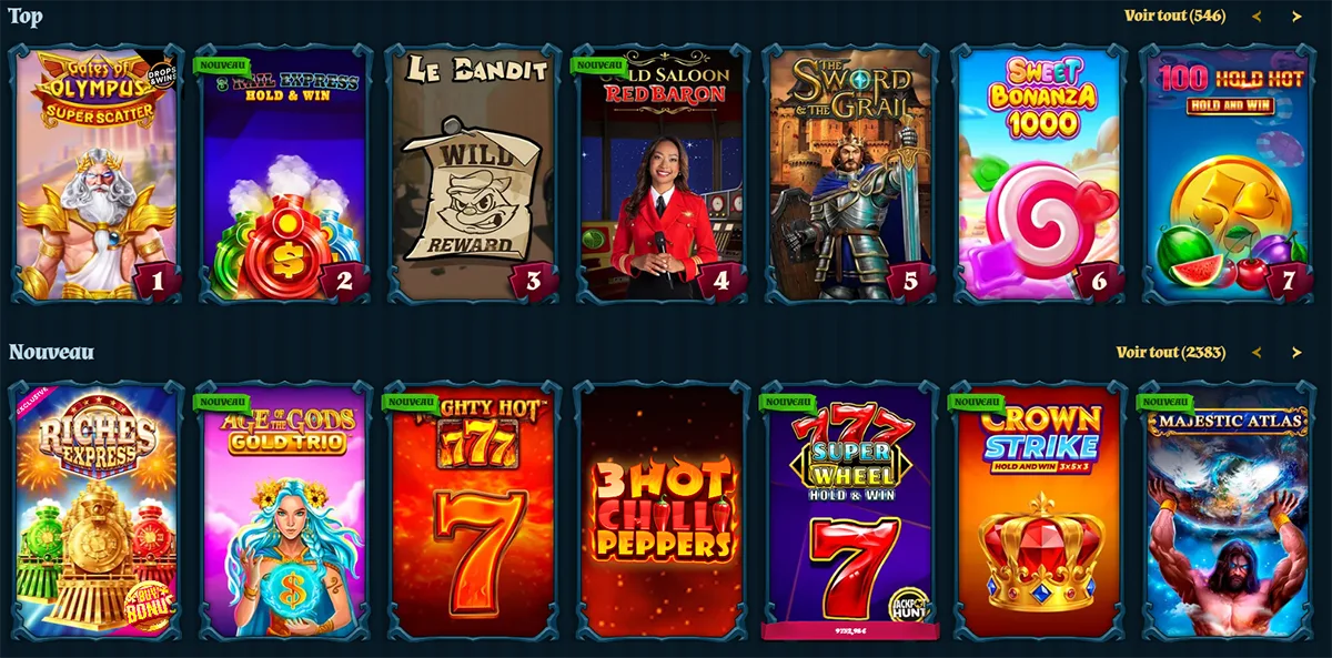 Nous retrouvons une sélection impressionnante de machines à sous développées par Play'n GO, Hacksaw Gaming et Pragmatic Play. Les jeux populaires incluent des machines classiques à fruits et des vidéoslots modernes.