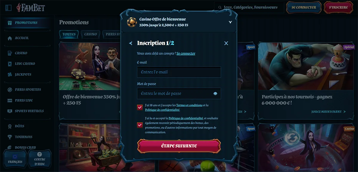 Le pack de bienvenue Fambet offre aux nouveaux joueurs jusqu'à 350% de bonus pour 2 500 € accompagné de 250 tours gratuits. Cette offre se divise en plusieurs dépôts successifs.